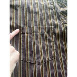 The Ermenegildo Zegna Button Up Shirt for men in size Large is a smart luxury office attire made in Italy. This multicolor shirt features a striped pattern, long sleeves, button closure, and a collared neckline with a point collar style. It is crafted from cotton material and is suitable for various occasions such as travel, parties, casual wear, and business meetings. With its classic Italian designer theme, this shirt offers a regular fit for a sophisticated and timeless look.