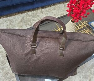 Elegant duffel bag with dark brown leather accents. Ideal for travel and daily use.