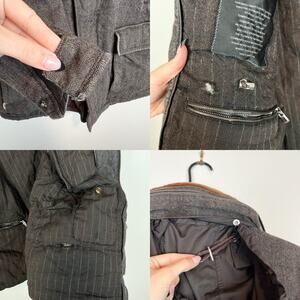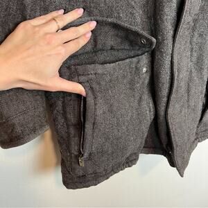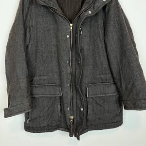 Has some wear as shown. Outer body has no major flaws but small flaws include some wear to sleeve cuff edges, mild wear to leather panels (inner wrist, shoulder inserts, collar trim), mild discoloration at hood toggles and collar, and a couple small holes on interior lining as shown. Holes do not go through to outer layer.