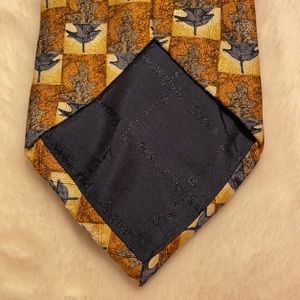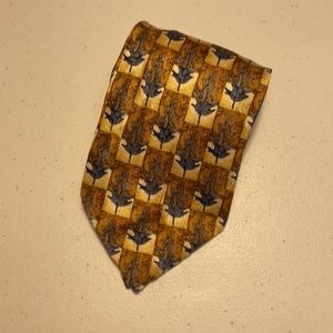 This tie is gold, blue and beige design. Preowned good condition. No strain, rips, or pulls.