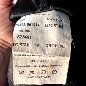 This Ermenegildo Zegna Herringbone suit jacket, made in Italy from 100% wool, is a stylish and sophisticated addition to any man's wardrobe. With its classic black color, herringbone pattern, and double-breasted design, this jacket exudes a timeless elegance. The jacket features a flat front, four-button sleeve button style, and a notch lapel for a refined look. Designed for a regular fit, this size 40R jacket is perfect for those who appreciate quality craftsmanship and classic style.