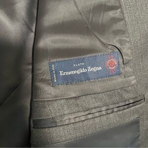 This is an Ermenegildo Zegna men’s gray 100% wool blazer. The blazer is a size 46 L. There is a small hole near the bottom on the back side of the coat (see next to last photo). Otherwise, the blazer is in great pre-owned condition. It will be shipped safely within one business day of purchase. Feel free to ask any questions. Thanks!