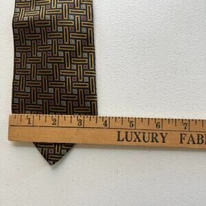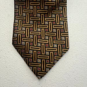 This Ermenegildo Zegna necktie is a luxurious and stylish accessory for men, featuring a classic geometric pattern in gold, black, and red colors. Made from 100% silk, this tie is crafted in Italy and showcases the brand's logo accents. With a traditional tie attachment type and one size fits all, this necktie is perfect for the office or a sophisticated casual occasion. The timeless elegance and craftsmanship make it a standout piece for any man's wardrobe.