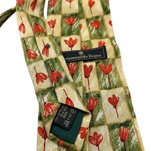 Ermenegildo Zegna Silk Tie 100% Red Flower Sage Green Yellow Italy