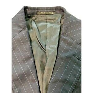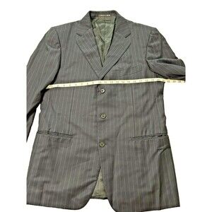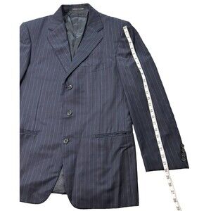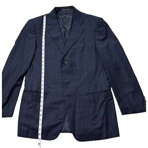 This Ermenegildo Zegna blazer is a classic piece that will never go out of style. Made from 100% wool, this Navy Blue blazer features a striped pattern, notch lapel style, and a single-breasted cut with three-button front button style. The blazer has a regular fit and a double-vented back, with a flat front and four-button sleeve button style. It is perfect for both casual and business occasions and can be worn in winter, fall, or spring. The blazer has inner pockets and is dry clean only. It is a size XL and has a chest size of 44.5. This Italian-made blazer is a great addition to any wardrobe and is sure to impress. Usually runs small. Made in Italy.
