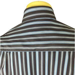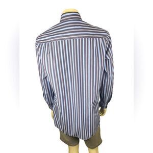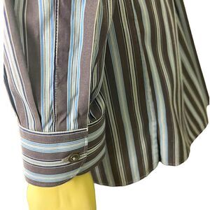 This gorgeous casual button down shirt is in perfect condition, is 100% cotton, with vertical stripes in charcoal gray, 3 shades of blue, black and white and features dark gray mother-of-pearl buttons. The Zegna design has single vents on each side (see photos) and the size extra large measures as follows: