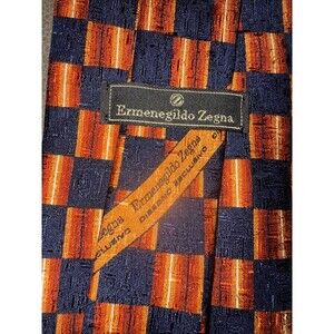 This is an Ermenegildo Zegna silk tie with a navy blue and orange checkered pattern