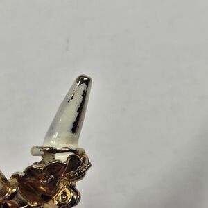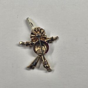 Vintage brooch in the shape of a clown. Signed on the back, very hard to discern, but I believe it reads Ernest Steiner. This clown is about 2 tall, and is goldtone metal with a pink and white outfit and rhinestones for his buttons and eyes. Some wear to the enamel as shown.