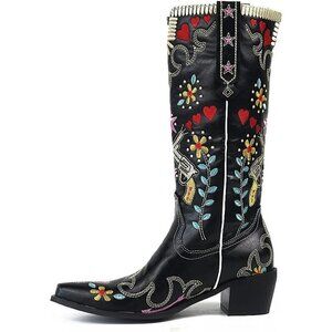 [Chunky Heel Western Cowboy Boots for Women]: Chunky block heel western combat boots for women. These women's western boots have vintage embroidered pattern