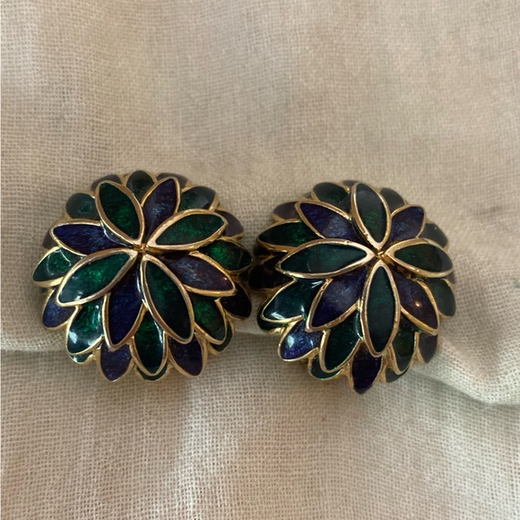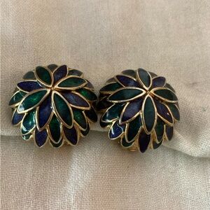 Erwin Pearl Blue & Green Enameled Vintage Clip on Earrings
