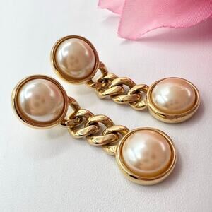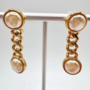 Erwin Pearl Faux Pearl Cabochon Curb Chain Drop Earrings Gold Tone Chic Signed