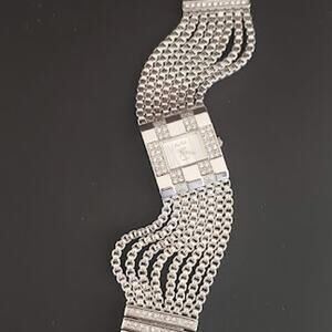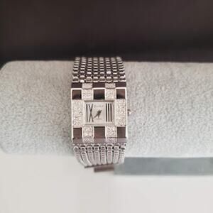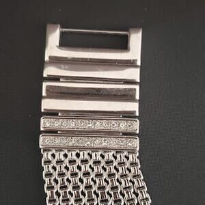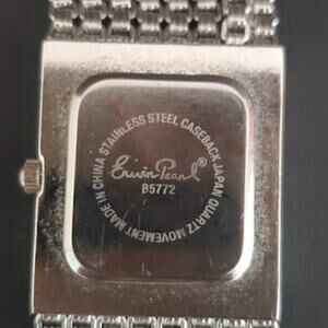 This Erwin Pearl watch has a mother of pearl dial that is 1/2 inch wide. The surrounding case is 1 inch wide and has rows of crystals that catch your eye and make this a stunning piece of jewelry. The band is 8 stainless steel bands that are gathered at the clasp by another row of crystals. Very good condition. Currently running with a fresh battery.