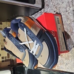 navy, tan and orange