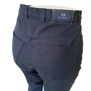 Escada 90s Y2K High waist Black Cotton Twill Women's Straight Leg Pants. 5 pocket styling. Logo on back pocket and and buttons