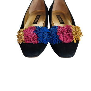 Black Square Toe Flats with colorful purple, magenta, and gold Suede pom poms Colorful Party Holidays New Years Eve
