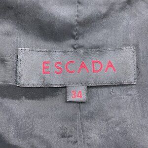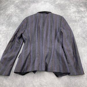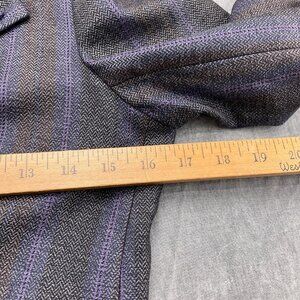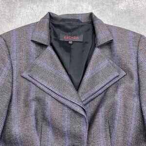 This ESCADA Blazer for women, size 34, features a classic gray purple stripe pattern with a herringbone layer collar. The 100% polyester suit jacket is perfect for a sophisticated and stylish appearance.