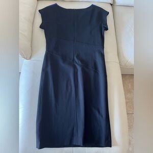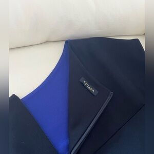 This beautiful Escada Dress is fully lined with a back center zipper. It has a deep deep blue, almost purple fabric top and black body. It has a classic silhouette with simple and elegant lines. It will be ideal for so many occasions!