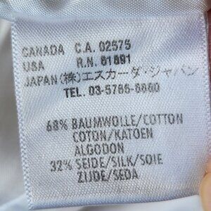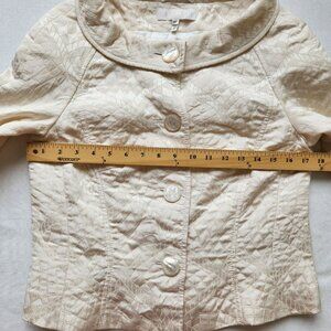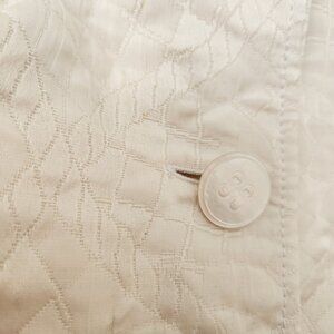 Beautiful vintage Escada jacket with a cropped silhouette, quilted design, shawl collar, button and snap front. Cotton and silk exterior with a rayon/viscose lining. Cream color with a white lining. Size 38.