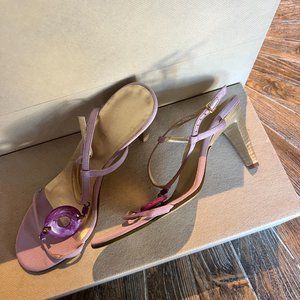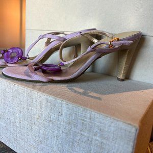 These super cute Escada heels have hardly been worn and are in excellent condition. The gold insoles match the gold hardware, while the purple fabric matches the purple disc. Fabulous and unique. They are perfectly on trend, but could also help you channel Barbie, hippie, or Y2K! Made in Italy.