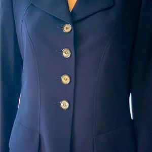 Escada Elements vintage blazer in deep navy 100% virgin wool. For all season wear. Detailed tailoring for the most flattering fit. Logo buttons in front and sleeves. Looks great paired with jeans or pencil skirt.In good condition with very small snag/hole about 1/8 of inch in left back upper sleeve. See Pic for better detail.