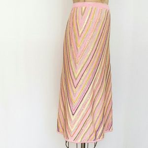 Pink + multicolored diagonally beaded knee-length knit skirt by Escada. Fully lined, with stretchy / elastic waistband, and leeway to knit fabric; it flows beautifully! Exquisitely crafted; the diagonal pattern / embellished design lines up perfectly at both side seams. 80% rayon / 20% cotton.