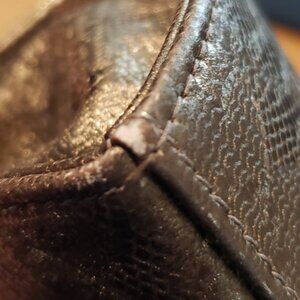 The brass hardware has some light surface scratches and a bottom corner shows little wear. See last picture.