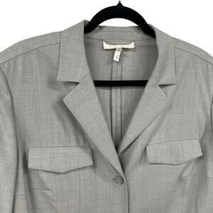 • Features: Button up front closure, Double front flap pockets, Light gray with subtle light blue pin striped plaid pattern, No fabric tag but feels like Linen Blend, Subtle shoulder pads