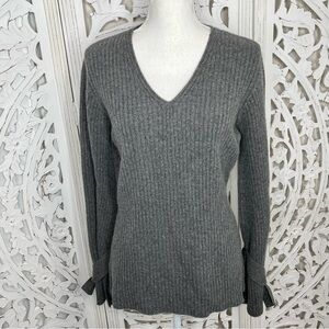 Escada Gray Ribbed Cashmere Virgin Wool Sweater in excellent pre-owned condition. V-neck ribbed style. Tunic length. Has pretty ties at sleeves. So soft! Cashmere and Virgin Wool Blend.