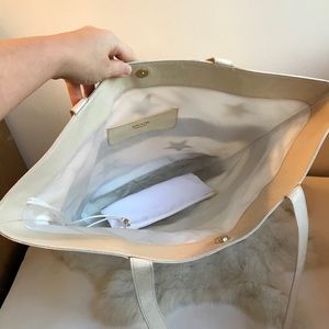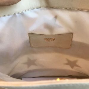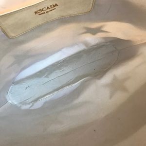 Escada leather and nylon striped tote bag with leather stars. Mesh nylon is translucent and see through. Large sized tote, perfect for shopping and the beach. Double shoulder straps. Comes with a water resistant bag.