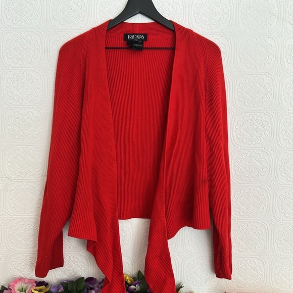 Elevate your wardrobe with this stunning red sweater from Escada. Perfect for any occasion, this piece offers both style and comfort and has front tie for a super chic look.