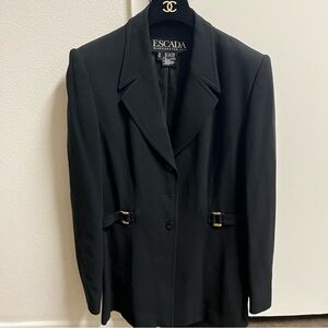 Gorgeous Escada Margarethe Ley vintage black, single breasted, three button closure front (one missing) wool blazer mid length belted jacket with gold belt detail hardware.