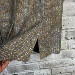 Elevate your wardrobe with the Escada Tweed Skirt, a blend of sophistication and sparkle. The luxurious mix of silk, nylon, and wool is impeccably crafted in Slovenia, featuring a gold and silver metallic tweed that captures the essence of high fashion. With a knee-length front and back double flutter slits straight and pencil style, it's a versatile piece that suits various occasions, from workwear to formal events. Attention to detail is evident with its mid-rise design, fully lined interior, and practical slit. The skirt offers ease of care with its machine-washable fabric and is adorned with subtle accents like buttons and a zipper closure, ensuring both functionality and style. Whether you're traveling, attending a wedding, or simply dressing for a day at the office, this Escada skirt is a classic timeless Old Money addition to any ensemble.