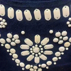 This chic and trendy sweater is perfect for any occasion. Soft cotton and cashmere blend. Navy blue with cream floral embellishments to chest. Scoop neck. Lightweight.