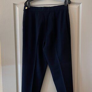 These navy blue pants by Escada Sport have a timeless style. Front zip pockets. Side zip and button closure. Size 42. Material composition: 90% wool, 10 % elastane. They are in great preloved condition with no exterior flaws. The material label shows wear from dry cleaning labels attached with staples. See photos for approximate waist and inseam measurements. Please note: The pants look black in some photos due to auto adjustments my phone camera was making. The pants are navy.