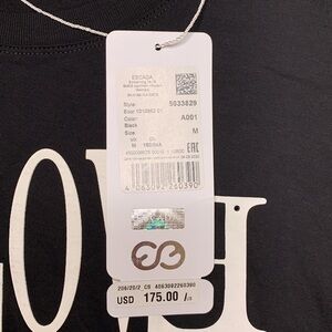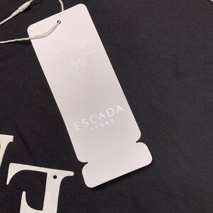 Escada Sport tee. Screenprint logo and art, slight cracking in the ink. Thin shoulder pads. 100% black cotton. New with tags, never worn. Womens size Medium.