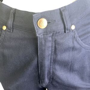 These luxurious high-waisted navy jeans from Escada Sport are unbelievably soft fabric, at 95% cotton and 5% spandex and tastefully finished with shining gold metal fittings. They feature a typical Jean silhouette, with 2 front slip hip pockets and 2 rear slip pockets. The size 34 measures as follows: