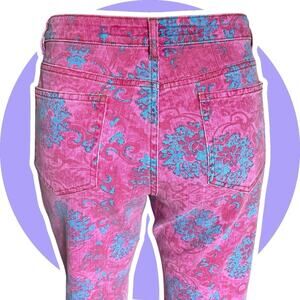 Style- Vintage Y2K Kate rose pink and blue baroque print floral jeans in a kick flare crop style, featuring a mid-rise waist with a 25.5-inch inseam. Made from a cotton blend denim fabric with a light wash, these jeans have a 5-pocket design with a zip and button closure. The floral pattern and pink color give them a feminine and playful look, perfect for the summer and spring seasons. The classic fit and stretch feature ensure comfort and style for any casual occasion. Made in Italy, these jeans embody an extravagant bohemian theme, adding a touch of fun to any wardrobe.