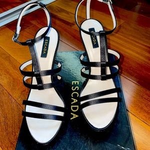 Escada Strappy High Heel Sandals, satin top, leather lining and sole, made in Italy, excellent like new condition (worn once)