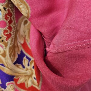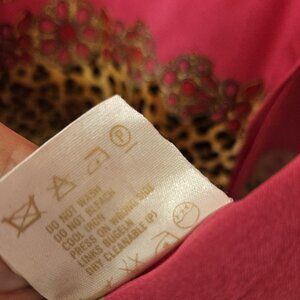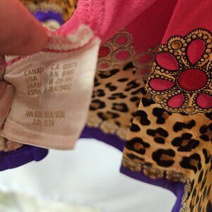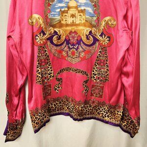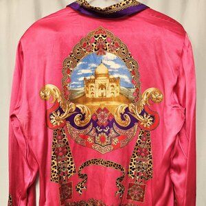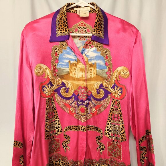 The great Vogue editor Diana Vreeland once said that "pink is the navy blue of India" -- the go-to color of a nation. So look at this divine vintage, made-in-Germany Escada classic silk blouse in pink charmeuse with fabulous images of the Taj Mahal, built by a Mughal Indian emperor to the memory of his beloved wife. It also has ribbons of leopard print and images of fabulously rich and legendary Mughal jewels, the wealth of centuries. The pink color is consistent throughout. Escada fans know that the blouses are slightly oversized. This size 42 measures 24 inches in length, 22 inches pit to pit, with a 25-inch sleeve and 17-inch shoulder. It is in splendid condition; please note last two photos, which show slight wear inside the left armpit, and the exterior of that armpit. From a smoke-free, dog-loving home. Free insured shipping. Your questions welcomed.