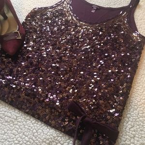 EUC. Escada, size 38 (fits like a women's small), dressy tank. Plum and gold sequin on front and straps, light sweater material on back. Front tie. Wool, silk and cashmere blend.