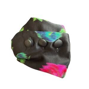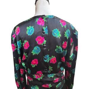 Gorgeous Vintage Escada Margarthea Levy black silk dress features magenta pink flowers in a faux wrap style. We always love it when dresses have side ruching, as it is so flattering and creates a lovely silhouette.