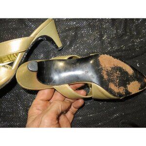 Escada Vintage Gold Satin & Leather Kitten Heeled Mules Sandals size 6 B