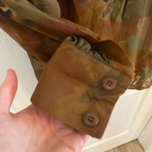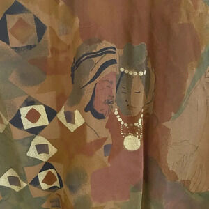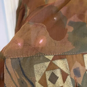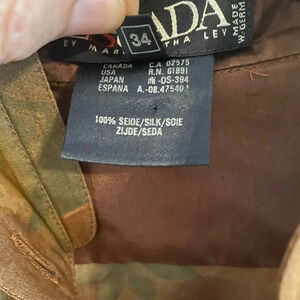 Escada Women Vintage 80s/90s Silk Button Up Blouse Size 34 (4) Brown Flaw. The print on this blouse is a middle eastern theme. See closeups of photos. This blouse is pre-owned. There are two small holes on the front of the blouse. See photo. Measurements: 20.5 inch chest 20 inch waist 27 inch length 23 inch arm length