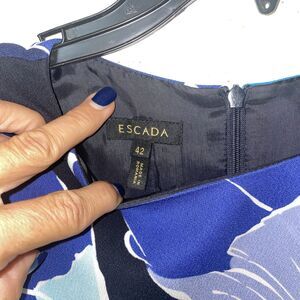 Escada cap sleeve shift dress. It features a floral print in shades of blue and white on a dark background. The dress is a shift style with a crew neckline and cap sleeves and hits around the knee. A slit on one side allows for easy movement.
