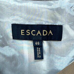 This chic Escada blazer offers a unique asymmetric design with gold detailing. Its sophisticated brown tone makes it ideal for professional settings.