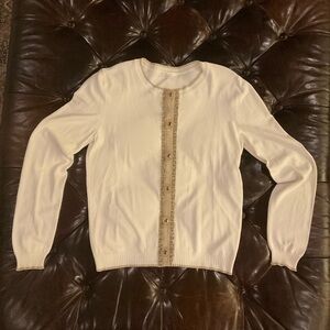 Escada beautiful cream lightweight sweater. Snap front closure. Beautiful buttons with shimmery crystal detail. Front appliqué is sequence with a lame gold detail.