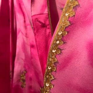 Escada beautiful 100% silk blouse. Missing top button (hidden). It is a plain pink button. The spare button shown in the photo is for the sleeve. Comfortable and pretty. The design is the material and is not raised. It is size 36 which is about a size S.