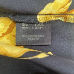 Escada by Margaretha Ley Silk safari blouse print design elephants, turtles and four leaf clovers. Two front pockets. Black and gold with 7 buttons with an engraved elephant.