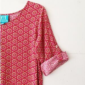 Escapada beach cover up / mini dress. Pullover styling. Wide round neckline. Three quarter sleeve. Sleeves have button and tab so they can be rolled and worn shorter. Unlined. Loop at back of collar for hanging dress to dry. Allover citrus inspired medallion print.