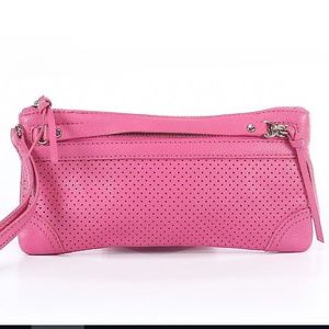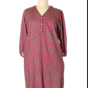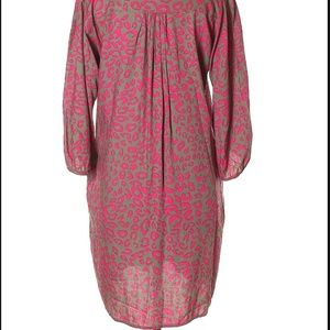 Collarless, greenish gray and pink leopard print, pullover style Escapada shift dress with two button front. This would be a perfect day to evening dress...with a blazer to work, throw on heels and remove the blazer for date night! 38" chest, 36" length. Rayon.